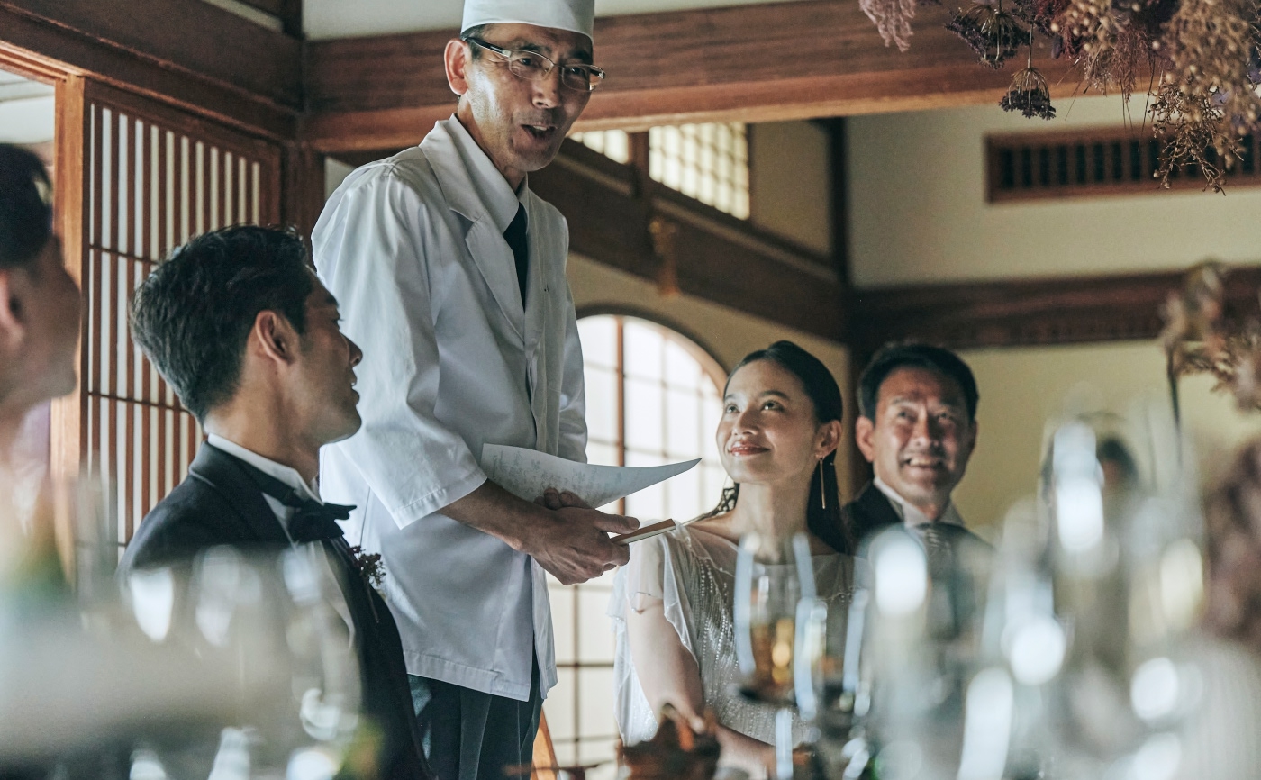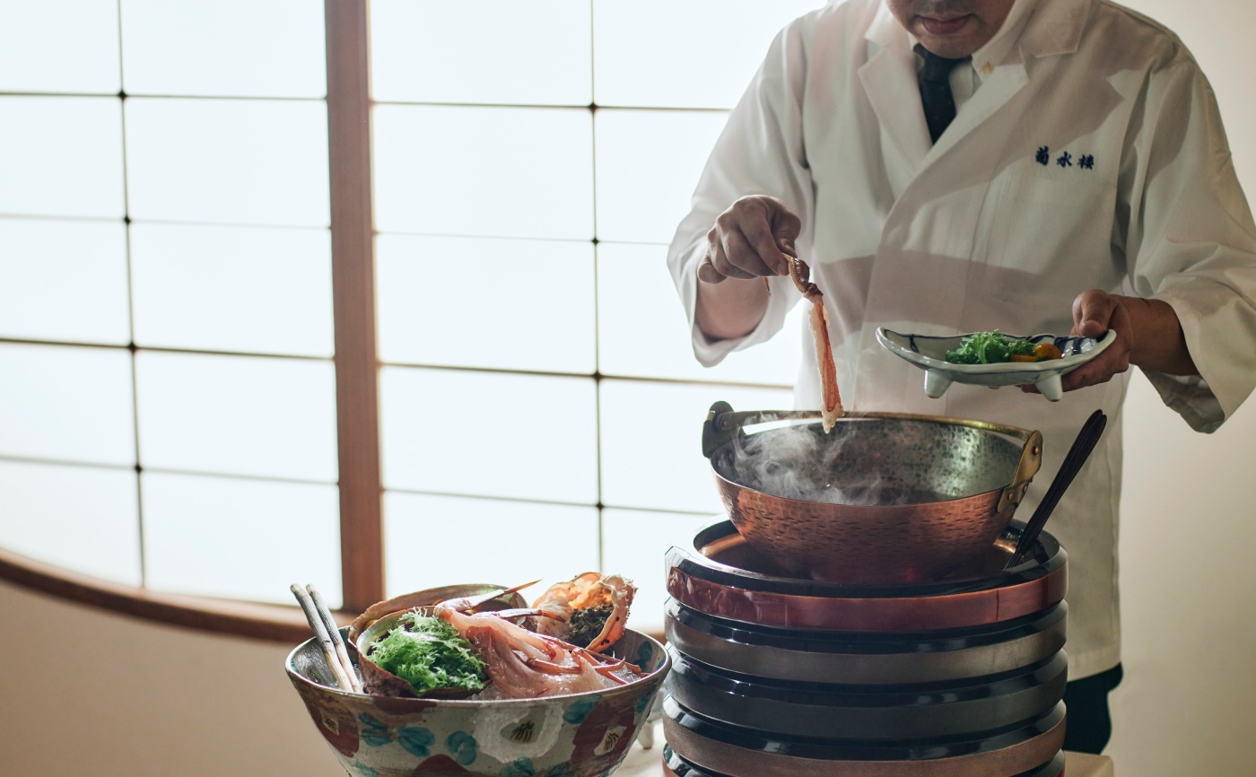 伝統的な文様とモダンなデザインが調和した「THE KIKUSUI」 オープンキッチンから運ばれるできたてのお料理 アットホームな距離感ではずむゲストとの会話 一面の窓から望む奈良の四季折々の景色 非日常のプライベート空間ならではのおもてなし